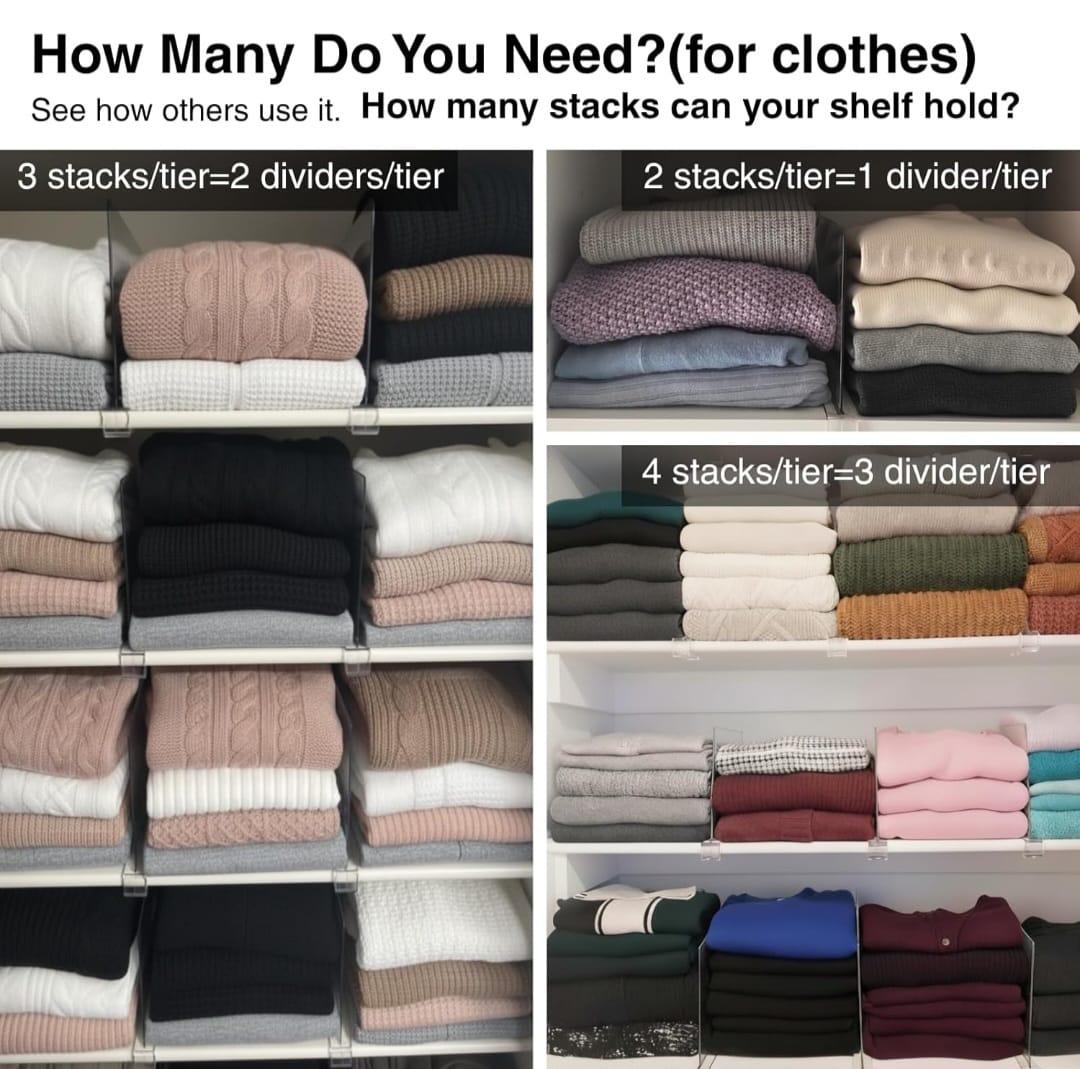 Organize your wardrobe, cupboard, or bookcase with these transparent closet shelf dividers. Available in sets of 2, 4, 6, or 8 pieces, they help create neat sections, making it easy to store clothes, books, or other items.